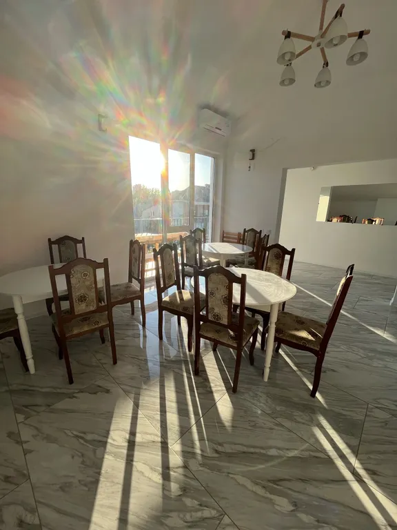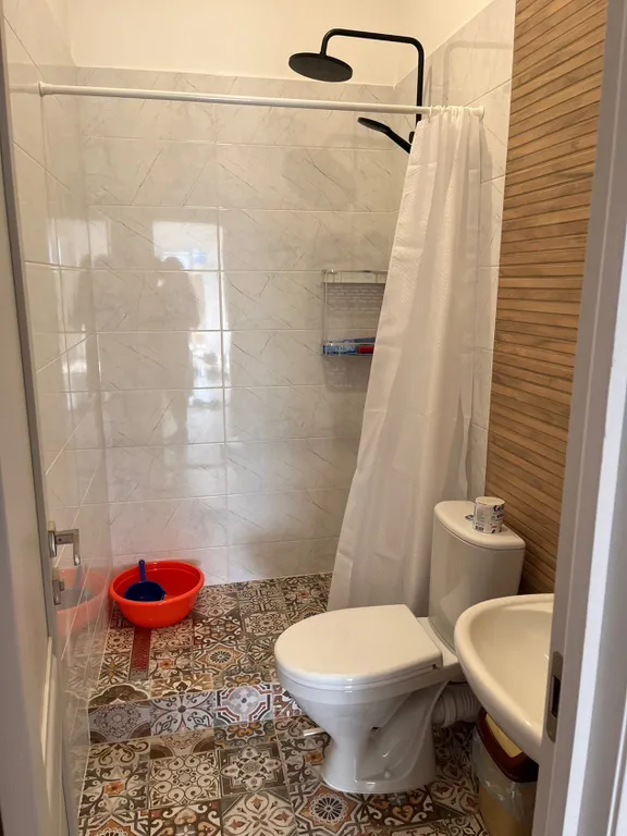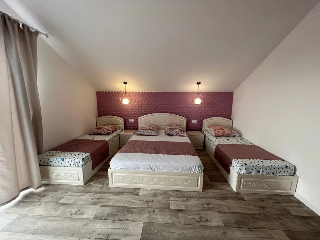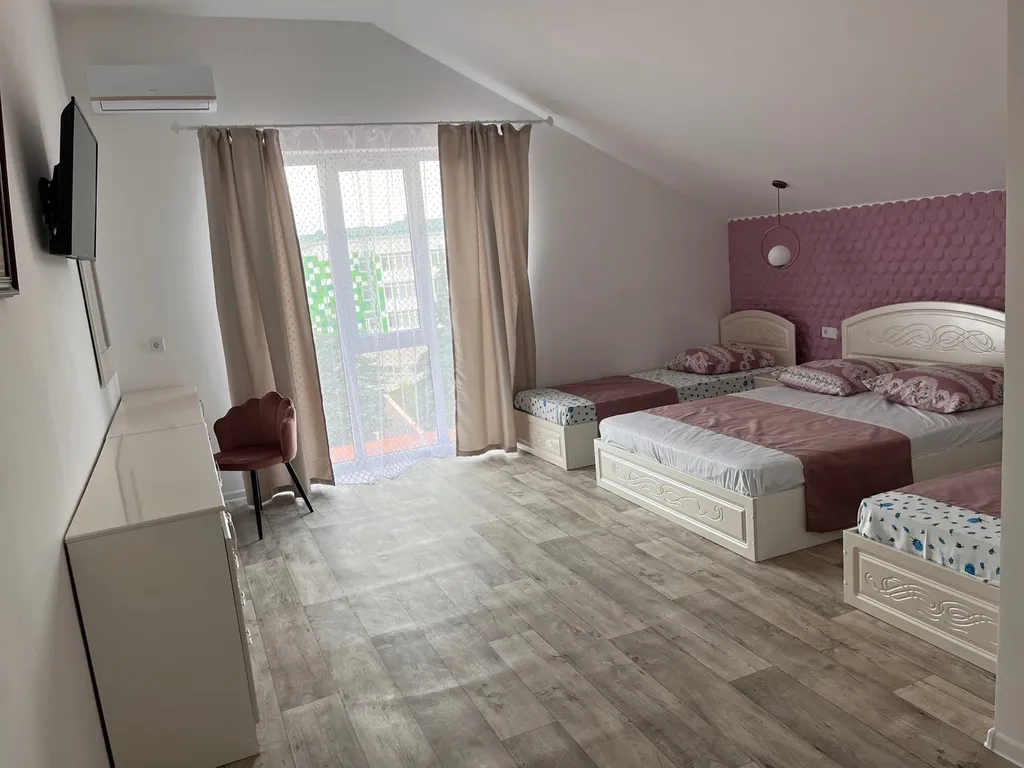 Дорогие ребята, мы сдаем однокомнатные комнаты с мая по ноябрь месяц. В комнате свой санузел в каждом. Кухня общая на две комнаты на этаже. В комнате двуспальная кровать и две односпальные, телевизор, кондиционер, холодильник, шкаф, постельное бельё. В санузле полотенца, мыло, ковшик, зеркало. В кухне шкафчики, посуда и обеденные столы для каждой комнаты отдельно. Электроплита, мойка, большой балкон для отдыха, там стоят столы и стулья, с правой стороны балкона сушится бельё. Лестница не крутая, 2-летние детки спокойно по ней ходят) Во дворе большая беседка для отдыха, качели, во …